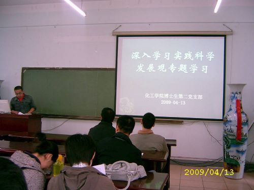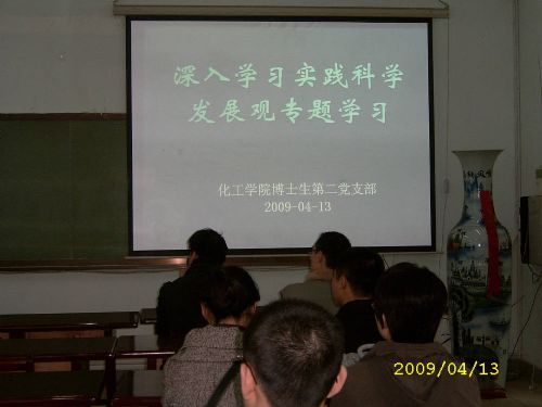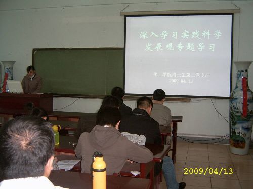 2009年4月13日上午10:00,在理学楼901会议室,化工学院博士生第二党支部书记徐宇虹同学主持召开了“深入学习实践科学发展观,加强学术道德和学风建设”讨论会,化工学院博士生第二党支部全体党员和积极分子参加了本次讨论会。