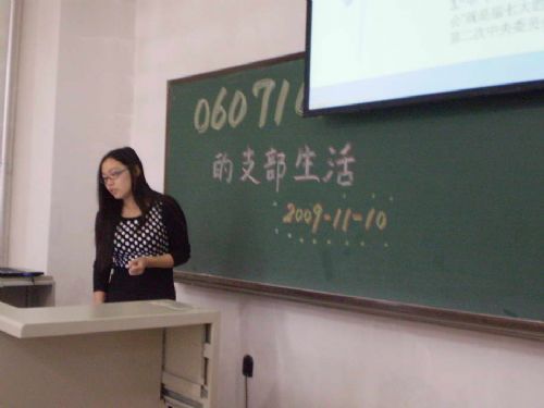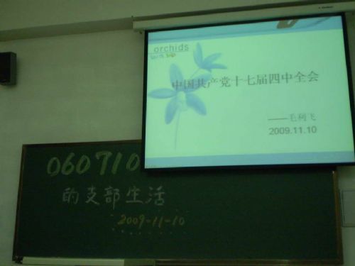 2009年11月10日晚6:30,0607101班党支部在正心112开展了“学习十七届四中全会精神”的活动,为带动班级同学的学习气氛,此次活动还邀请了部分同学参与。会议由党支部书记毛利飞同学主持。
