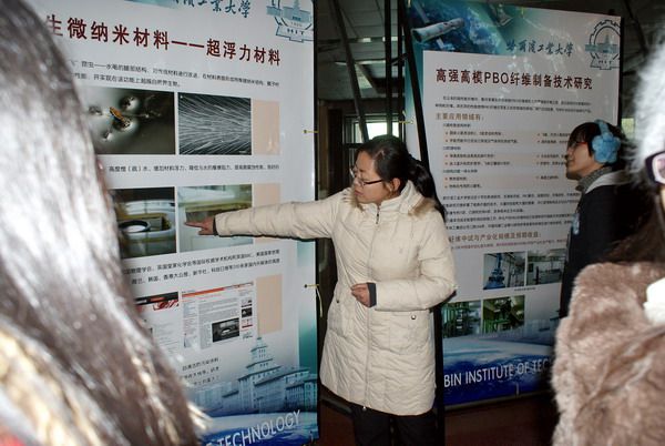 2009年11月18日中午12:30,由化工学院主办的研究生学术活动月系列活动之“钟灵工大,毓秀化工”——化工学院科研成果展在理学楼一楼隆重举行。 化工学院研究生协理员王玉楠老师、相关研究领域的博士生研究生及化工学院研一的全体同学参加了此次活动。 同学们首先参观了化工科研成果展板,并与科研成果讲解员进行了交流与讨论,随后讲解员分别对五项科研成果进行了具体介绍,夏士兴博士为大家介绍了有关于磷化锗锌晶体生长与器件制造以及无污染、低能耗高纯硅烷制备新技术的成果,崔闻宇博士讲解了动力磷酸铁锂电池制造技术的发展与应用,刘佳同学对仿生物纳米材料——超浮力材料方面的进展做了详细介绍,王峰博士为大家讲解了关于高强高模PBO纤维制备技术的发展,之后同学们参观了晶体生长实验室,详细了解了多晶体的制备过程,最后同学们分别向讲解员提出了自己的问题与疑惑并得到了满意的答复。 通过此次活动,同学们进一步了解了化工学科的最前沿动态以及学院的最新科研成果,开阔了视野、丰富了学术思维,营造了良好的热爱科学、追求真理的学术氛围。