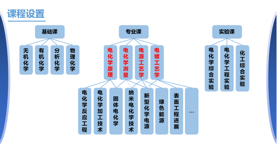 电化学工程系坚持立德树人根本任务,秉承“规格严格,功夫到家”的校训,着力培养热爱祖国、信念执着、知行合一、求真务实、励志奋斗,具有社会责任感和国际视野,具备系统的化工化学知识结构和解决复杂工程问题能力,具有沟通协作能力和终身学习能力,能在电化学及相关领域引领未来发展的创新人才。大学前两年主要着重培养学生的科学知识基础,包括设立数学、物理、多门化学等工科通识教育基础课程;随后围绕电化学工程系专业特色开设包括《电化学原理》、《化学电源工艺学》、《电镀工艺学》、《电化学测量》四大专业课。同时开设《新型化学电源》、《固体电化学》等核心特色专业课程以及《化工综合实验课》、《电化学综合实验》、《电化学工程实验》电化学实验课程。
