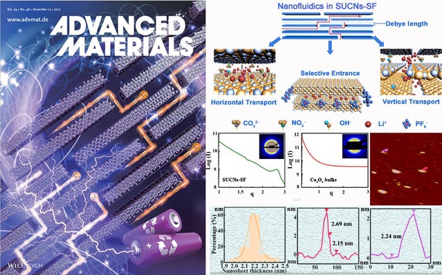 我院陈刚教授带领的能量转换材料团队在锂离子电池负极材料的研究方面取得重要进展。研究成果以通讯文章(Communication)的形式发表于材料科学领域顶级期刊《Advanced Materilas》(影响因子19.79),论文题目为《构建二维纳米流体通道以实现优异的电化学能量储存》(Engineering 2D Nanofluidic Li-Ion Transport Channels for Superior Electrochemical Energy Storage),该文章被选为当期封面文章(Front Cover),陈刚教授为文章通讯作者,团队博士生闫春爽和吕查德为共同第一作者,我校为第一通讯单位。