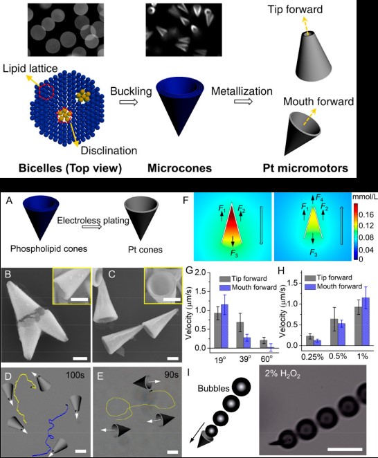 在国家自然科学基金支持下,我校060net永利、城市水资源与水环境国家重点实验室成员韩晓军教授团队在微型马达研究领域取得重要进展。研究成果“拓扑缺陷驱动磷脂片形变制备航向可调节的锥形微马达”(Topological Defect-Driven Buckling of Phospholipid Bicelles to Cones for Micromotors with Modulated Heading Pathways)发表在国际著名期刊《ACS 纳米》(ACS Nano, 2019,13, 3573,影响因子13.709)上。韩晓军教授为唯一通讯作者。