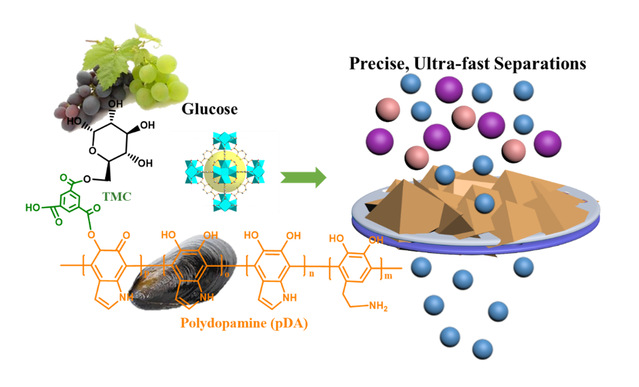 水体中重金属离子与染料分子的去除对于生产饮用水和工业用水至关重要,但是基于蒸馏的纯化和分离方法需要消耗大量能源,而且不可避免地产生大量固体废弃物。近些年,低能耗的膜分离技术逐渐替代了传统的蒸馏技术。然而聚合物膜的合成需要以化石燃料为原材料,不利于膜分离技术的环境友好性。界面聚合反应提供了一种潜在的可拓展的解决方案,但是大多数天然材料由于其低化学稳定性和低分离性能导致在膜分离过程中并不适用。因此,迫切需要开发可在膜清洁过程中应用的天然材料。
