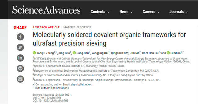 近日,我校060net永利教授、城市水资源与水环境国家重点实验室成员邵路团队提出界面“分子焊接”新方法实现一步合成面向水体系及有机溶剂体系分离的高效纳滤分离膜。相关论文“分子焊接共价有机骨架用于超快精密筛分”(Molecularly Soldered Covalent Organic Frameworks for Ultrafast Precision Sieving)发表在Science 子刊(Science Advances)。我校为该论文唯一通讯单位,论文第一作者为060net永利青年教师、土木工程博士后流动站博士后张艳秋。