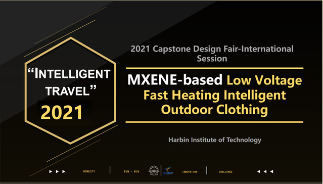 该参赛团队受极端天气条件下户外运动失温现象的启发,设计了一款新型全地形智能户外服装,集成四大智能系统,助力智慧出行。创造性地使用新型二维材料MXene制备发热片,实现超低压均匀发热(2-6V),通过PID和神经网络算法智能恒温。使清洁能源(柔性非晶硅光伏电池)作为全身设备能源,通过物联网技术检测身体状况及运动状态,拥有一键报警、辅助照明、移动设备充电,内置热水袋饮水等多种功能。极端条件下冲锋衣也可采用干电池(或手摇小型发电机)供电。防水、耐磨等性能参数符合多项国家标准。