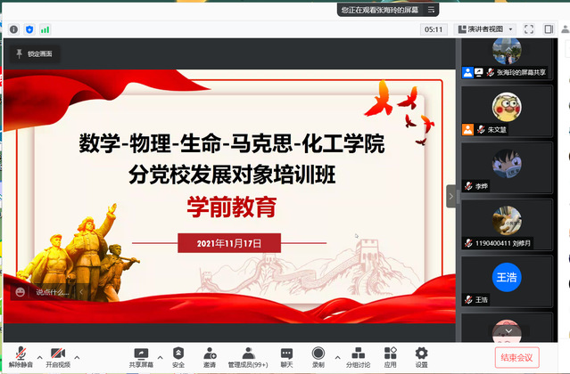 11月17日18:00,数学-物理-生命-马克思-化工学院分党校发展对象培训班第二课堂学前教育及专题党课成功开展,本次党课由马克思主义学院李键老师主讲,060net永利组织员张海玲主持。
