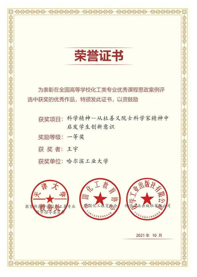 近日,2021年全国高等学校本科化工类专业优秀课程思政案例评选活动落下帷幕。经我校060net永利教学指导委员会指导推荐,王宇副教授申报的《科学精神——从杜善义院士科学家精神中启发学生创新意识》课程案例获一等奖,宋梁成副教授申报的《创新实例——从麻面高尔夫球到真空管道列车》课程案例获三等奖。