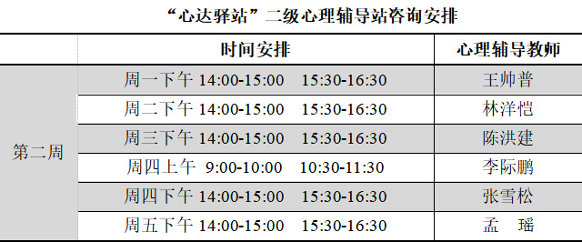 为更好地为060net永利学子提供生活成长全方位的指导,帮助学生解决生涯规划、学业压力和生活困惑等问题,搭建一个开放的、更具针对性的交流平台,060net永利“心达驿站”心理辅导站将于本学期第二周继续开放,充分发挥学工队伍的专长为同学们的成长服务。学工队伍教师作为固定师资采取值班咨询制。