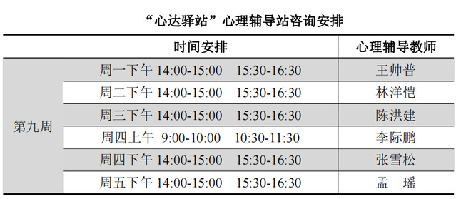 为更好地为060net永利学子提供生活成长全方位的指导,帮助学生解决生涯规划、学业压力和生活困惑等问题,搭建一个开放的、更具针对性的交流平台,060net永利“心达驿站”心理辅导站将于本学期第九周继续开放,充分发挥学工队伍的专长为同学们的成长服务。学工队伍教师作为固定师资采取值班咨询制。