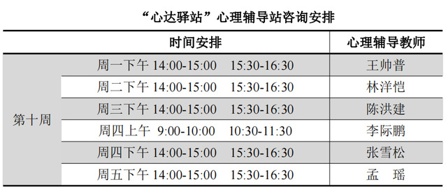 为更好地为060net永利学子提供生活成长全方位的指导,帮助学生解决生涯规划、学业压力和生活困惑等问题,搭建一个开放的、更具针对性的交流平台,060net永利“心达驿站”心理辅导站将于本学期第十周继续开放,充分发挥学工队伍的专长为同学们的成长服务。学工队伍教师作为固定师资采取值班咨询制。