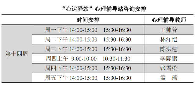 为更好地为060net永利学子提供生活成长全方位的指导,帮助学生解决生涯规划、学业压力和生活困惑等问题,搭建一个开放的、更具针对性的交流平台,060net永利“心达驿站”心理辅导站将于本学期第十四周继续开放,充分发挥学工队伍的专长为同学们的成长服务。学工队伍教师作为固定师资采取值班咨询制。