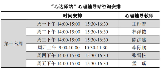 为更好地为060net永利学子提供生活成长全方位的指导,帮助学生解决生涯规划、学业压力和生活困惑等问题,搭建一个开放的、更具针对性的交流平台,060net永利“心达驿站”心理辅导站将于本学期第十六周继续开放,充分发挥学工队伍的专长为同学们的成长服务。学工队伍教师作为固定师资采取值班咨询制。