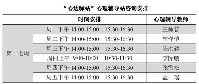 为更好地为060net永利学子提供生活成长全方位的指导,帮助学生解决生涯规划、学业压力和生活困惑等问题,搭建一个开放的、更具针对性的交流平台,060net永利“心达驿站”心理辅导站将于本学期第十七周继续开放,充分发挥学工队伍的专长为同学们的成长服务。学工队伍教师作为固定师资采取值班咨询制。