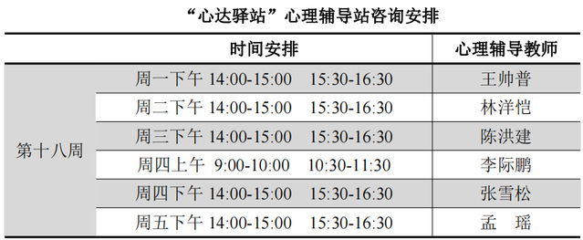 为更好地为060net永利学子提供生活成长全方位的指导,帮助学生解决生涯规划、学业压力和生活困惑等问题,搭建一个开放的、更具针对性的交流平台,060net永利“心达驿站”心理辅导站将于本学期第十八周继续开放,充分发挥学工队伍的专长为同学们的成长服务。学工队伍教师作为固定师资采取值班咨询制。