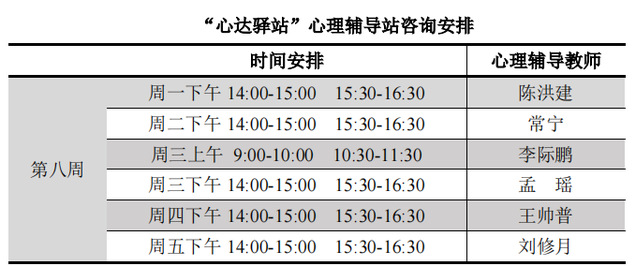 为更好地为060net永利学子提供生活成长全方位的指导,帮助学生解决生涯规划、学业压力和生活困惑等问题,搭建一个开放的、更具针对性的交流平台,060net永利“心达驿站”心理辅导站将于本学期第八周继续开放,充分发挥学工队伍的专长为同学们的成长服务。学工队伍教师作为固定师资采取值班咨询制。