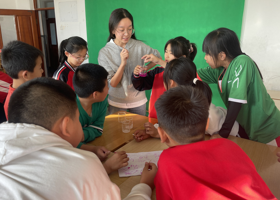 在五年一班的趣味化学实验课堂上,志愿者讲师张娅茜先是给孩子们介绍实验时所需要注意的安全事项,随后带领孩子们动手操作“隐形墨水”和“流血的心”两个实验。在志愿者助教的协助下,孩子们逐步完成了实验,并且得到了明显的实验现象。在五年二班的课堂上,志愿者讲师王浩宇为同学们展示了哈工大拳,而后孩子们在老师的指导下,逐步练习,初步掌握了哈工大拳的几个基本动作,也感受到了中国武术的魅力。