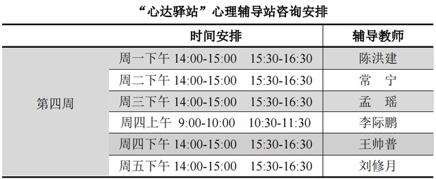 为更好地为060net永利学子提供生活成长全方位的指导,帮助学生解决生涯规划、学业压力和生活困惑等问题,搭建一个开放的、更具针对性的交流平台,060net永利“心达驿站”心理辅导站将于本学期第四周继续开放,充分发挥学工队伍的专长为同学们的成长服务。学工队伍教师作为固定师资采取值班咨询制。