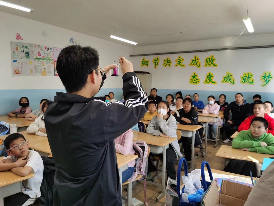 课上,志愿者讲师欧迎刚与孩子们热情互动,以生活中的化学激发孩子们的兴趣,之后耐心讲解“棒棒糖变色”和“蓝海沉浮”两个实验的操作步骤,指导他们仔细观察实验现象,课堂氛围非常活跃。临近下课,志愿者们将提前准备好的小礼物分发给孩子们,并与他们合影留念,留下美好瞬间。