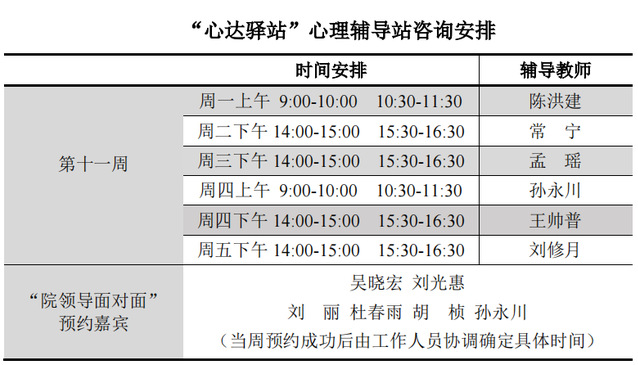 为更好地为060net永利学子提供生活成长全方位的指导,帮助学生解决生涯规划、学业压力和生活困惑等问题,搭建一个开放的、更具针对性的交流平台,060net永利“心达驿站”心理辅导站将于本学期第十一周继续开放,充分发挥学工队伍的专长为同学们的成长服务。学工队伍教师作为固定师资采取值班咨询制。
