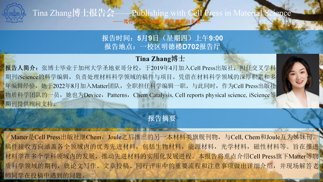 5月9日,受学院齐殿鹏教授邀请,Matter期刊编辑张甜甜博士来院交流,并做了题为《Publishing with Cell Press in Material Science》的报告。会议由学院党委书记刘光惠主持,来自化工、材料、环境等学院80余名师生参加了此次论坛。