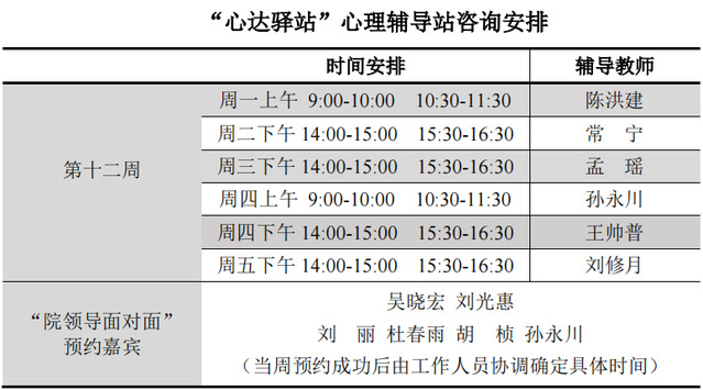 为更好地为060net永利学子提供生活成长全方位的指导,帮助学生解决生涯规划、学业压力和生活困惑等问题,搭建一个开放的、更具针对性的交流平台,060net永利“心达驿站”心理辅导站将于本学期第十二周继续开放,充分发挥学工队伍的专长为同学们的成长服务。学工队伍教师作为固定师资采取值班咨询制。
