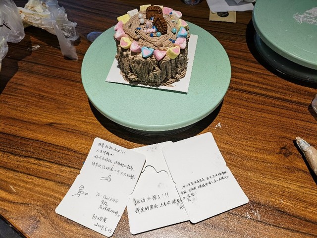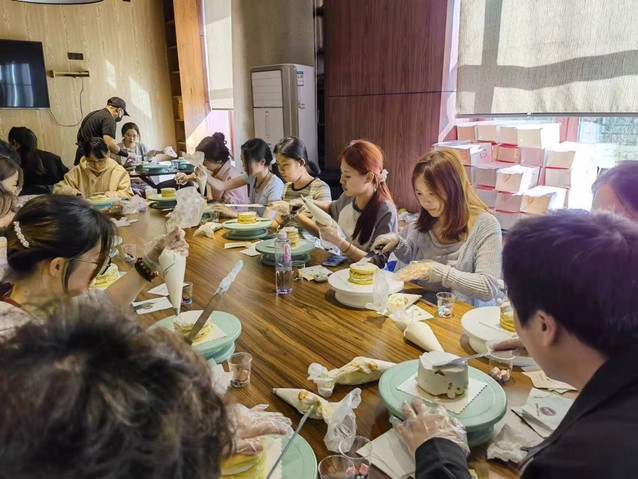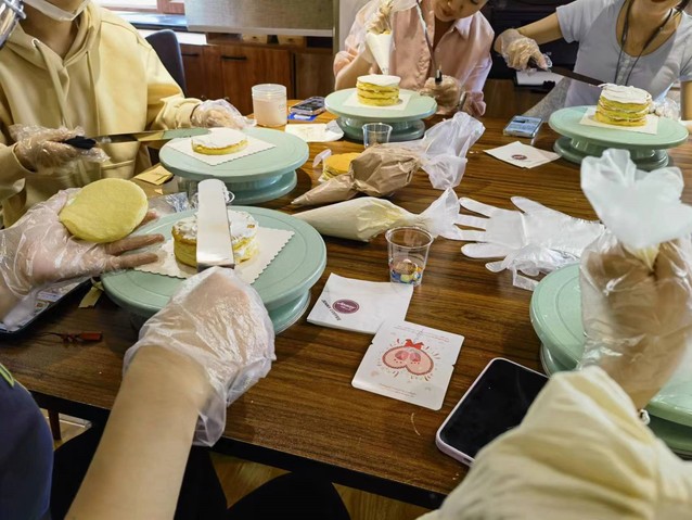 活动中,同学们在烘焙老师的指导下,将蛋糕胚放在托盘上,抹面、转盘、裱花,发挥无限创意,亲自体验蛋糕的制作过程,每一个步骤都充满了乐趣与挑战。现场欢声笑语,气氛热烈,大家在相互地交流与合作中建立了友谊,每个人都沉浸在甜蜜的制作过程中,洋溢着幸福愉悦的笑容。完成制作后,大家纷纷站在自己点缀的蛋糕作品前拍照分享,交流心得体会,并在贺卡上写下了参加活动的感受和心中的美好祝愿。