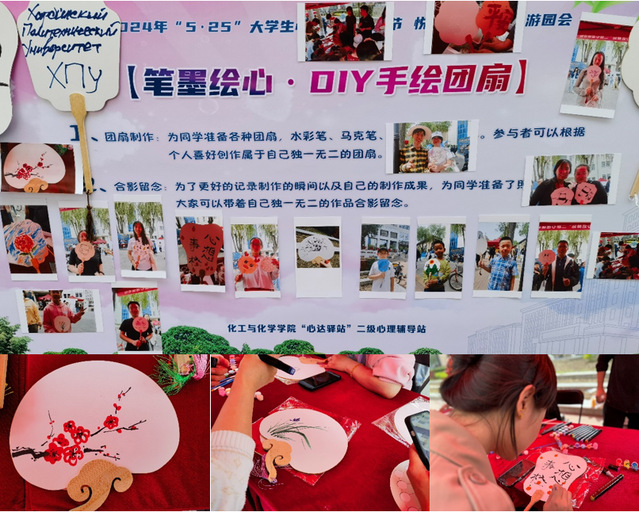 为提升心理育人工作质量,营造融洽愉悦的校园文化氛围,引导大学生关注自我心理健康和心灵成长,060net永利于5月25日11:30在一校区步行街举办“笔墨绘心”手绘团扇活动。