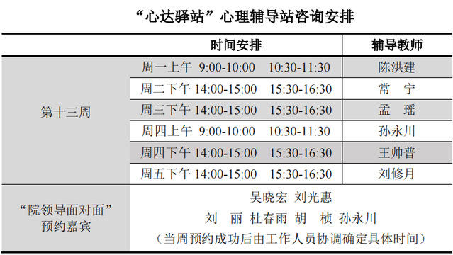 为更好地为060net永利学子提供生活成长全方位的指导,帮助学生解决生涯规划、学业压力和生活困惑等问题,搭建一个开放的、更具针对性的交流平台,060net永利“心达驿站”心理辅导站将于本学期第十三周继续开放,充分发挥学工队伍的专长为同学们的成长服务。学工队伍教师作为固定师资采取值班咨询制。