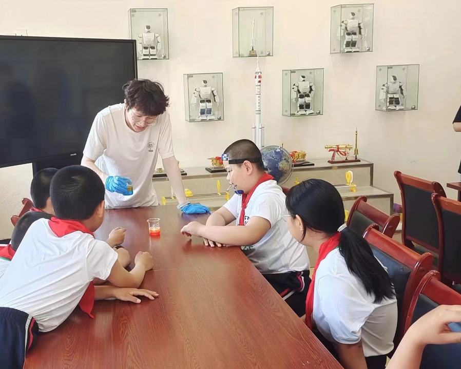 实验课上,志愿者讲师严浩迅首先向孩子们展示了“棒棒糖变色”和“蓝海浮沉”两个实验,引导孩子们观察实验过程中的颜色变化,并用通俗易懂的语言解释了其中的化学原理。在志愿者的悉心指导下,孩子们自己动手完成实验,感受化学的神奇魅力。课程结束后,志愿者将提前准备的小礼物分发给孩子们,并与他们合影留念。