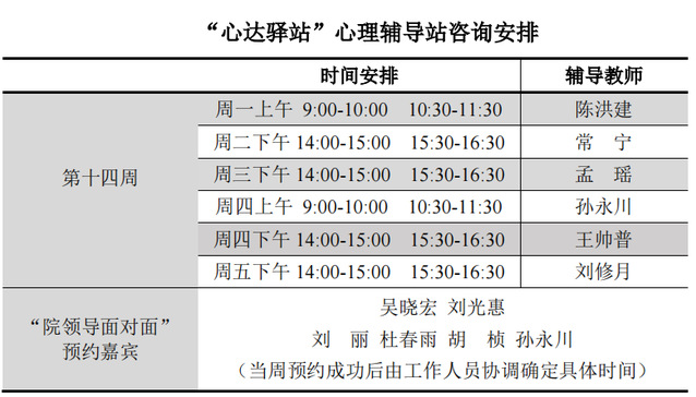 为更好地为060net永利学子提供生活成长全方位的指导,帮助学生解决生涯规划、学业压力和生活困惑等问题,搭建一个开放的、更具针对性的交流平台,060net永利“心达驿站”心理辅导站将于本学期第十四周继续开放,充分发挥学工队伍的专长为同学们的成长服务。学工队伍教师作为固定师资采取值班咨询制。