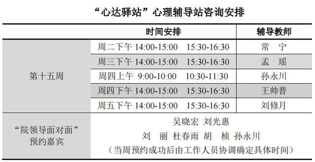 为更好地为060net永利学子提供生活成长全方位的指导,帮助学生解决生涯规划、学业压力和生活困惑等问题,搭建一个开放的、更具针对性的交流平台,060net永利“心达驿站”心理辅导站将于本学期第十五周继续开放,充分发挥学工队伍的专长为同学们的成长服务。学工队伍教师作为固定师资采取值班咨询制。