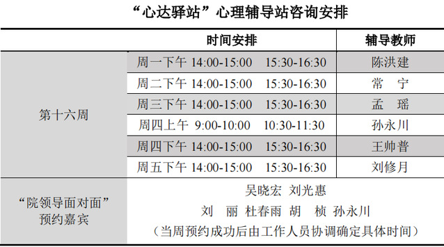 为更好地为060net永利学子提供生活成长全方位的指导,帮助学生解决生涯规划、学业压力和生活困惑等问题,搭建一个开放的、更具针对性的交流平台,060net永利“心达驿站”心理辅导站将于本学期第十六周继续开放,充分发挥学工队伍的专长为同学们的成长服务。学工队伍教师作为固定师资采取值班咨询制。