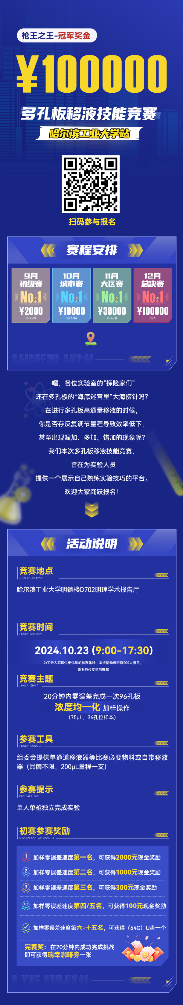 在20分钟内成功且无失误完成样品浓度均一化(75uL,36孔位样本);主办方提供所需材料及用具,比赛时可选择自带移液器(品牌不限,200L量程一支)或使用科易为自动化单通道移液器;比赛分小组进行,2人一组(最多4组)同时进行比赛,参赛者需单人单枪独立完成实验,完成时间计入比赛成绩。