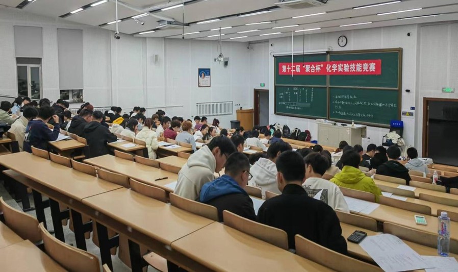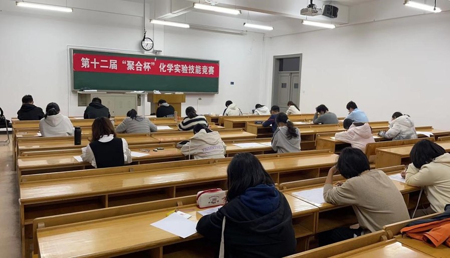 初赛以三人小组合作答题的形式开展,笔试前60分钟自主答题,后20分钟进行组内讨论、确定答案并最终上交一份答卷。一、二校区同步答题,考场氛围严肃认真,面对竞赛试卷,各小组成员分工明确、积极讨论,在规定时间完成考试内容。根据《第十二届“聚合杯”化学实验技能竞赛的通知》的要求,经过笔试环节筛选,共有12组晋级。
