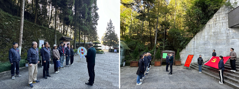 井冈山革命烈士陵园于1987年建成,为纪念井冈山斗争时期牺牲的革命先烈而建。在登上象征着1949年新中国成立的49级台阶和寓意陵园建成年份的60级台阶后,全体学员在革命烈士纪念碑前敬献花圈,向革命先烈鞠躬并默哀,表达深切的缅怀和哀思。随后在党旗前重温入党誓词,坚定理想信念。