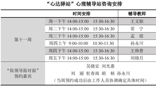 为更好地为060net永利学子提供生活成长全方位的指导,帮助学生解决生涯规划、学业压力和生活困惑等问题,搭建一个开放的、更具针对性的交流平台,060net永利“心达驿站”心理辅导站将于本学期第十一周继续开放,充分发挥学工队伍的专长为同学们的成长服务。学工队伍教师作为固定师资采取值班咨询制。