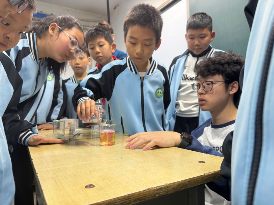 实验课上,志愿者讲师田宇和文玺为四年级一班的孩子们演示了“荧光鲁米诺”和“熔岩之舞”两个精彩的化学实验,并耐心讲解其中的化学原理。在志愿者的指导与鼓励下,大家兴致勃勃地参与实验操作,感受科学的无穷魅力。最后,志愿者将精心准备的小礼物送给孩子们,并合影留念。