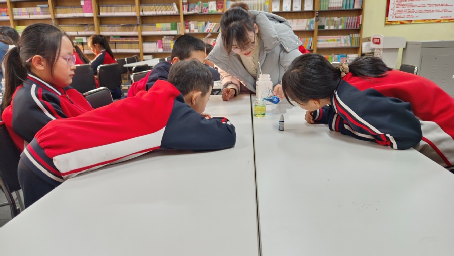 实验课上,志愿者讲师段玮凡和王子琦为四年级学生演示了“荧光鲁米诺”和“熔岩之舞”两个精彩的化学实验,并深入浅出地讲解其中的化学原理。在两位讲师的鼓励下,学生们动手尝试实验。课程结束后,志愿者们将提前准备好的小礼物分发给大家,并合影留念。