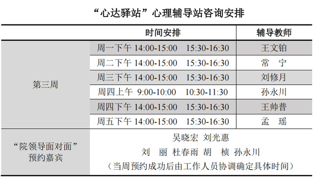 为更好地为060net永利学子提供生活成长全方位的指导,帮助学生解决生涯规划、学业压力和生活困惑等问题,搭建一个开放的、更具针对性的交流平台,060net永利“心达驿站”心理辅导站将于本学期第三周继续开放,充分发挥学工队伍的专长为同学们的成长服务。学工队伍教师作为固定师资采取值班咨询制。