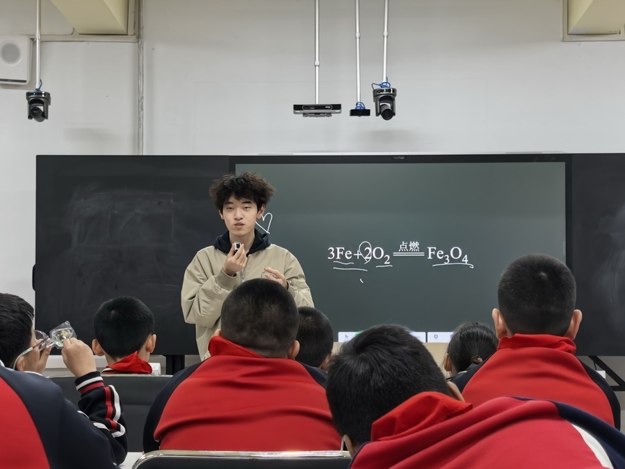 在实验环节中,志愿者讲师乔云通过演示教科书中“铁丝在氧气中燃烧”实验,带领学生探索其中的科学奥秘。被引燃的铁丝在放入氧气中的瞬间迸发出耀眼的火星,学生们直观观察到了金属燃烧的现象和氧化反应的本质特征并记录实验过程。在教学过程中,讲师通过启发式提问引导学生思考金属燃烧的相关知识,并讲解了航天器材料的选用、太空中火焰燃烧的特殊形态等知识。