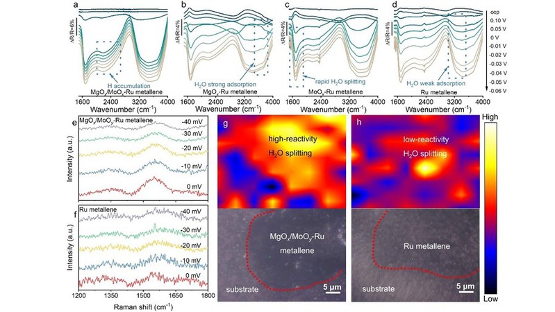 基于此,团队采用简单的盐模板法,通过在空气中低温煅烧乙酰丙酮盐实现了超薄非晶Ru金属烯的克级制备。镁和钼位点的引入使非晶钌金属烯的析氢反应质量活性在100 mV过电位下提高了15.3倍,在10mA cm−2的电流密度下表现出8.5mV的超低过电位。研究结果表明,镁位点通过p-p相互作用富集界面水分子,钼位点通过填充氢-氧反键轨道降低水分解能垒,镁和钼位点协同促进水分子的吸附-分解,从而大幅提高钌金属烯的碱性析氢反应活性。该方案通过构建超薄二维结构并引入协同作用位点大幅提高贵金属钌的使用率和活性,有望实现钌基催化剂对贵价铂基催化剂的替代。