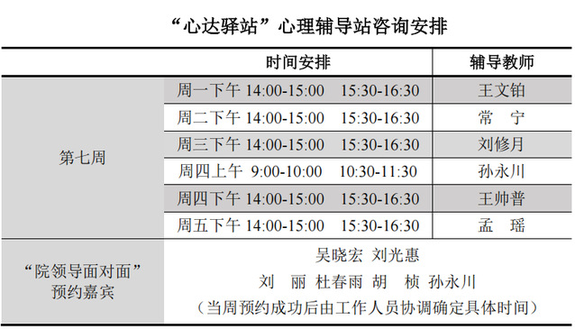 为更好地为060net永利学子提供生活成长全方位的指导,帮助学生解决生涯规划、学业压力和生活困惑等问题,搭建一个开放的、更具针对性的交流平台,060net永利“心达驿站”心理辅导站将于本学期第六周继续开放,充分发挥学工队伍的专长为同学们的成长服务。学工队伍教师作为固定师资采取值班咨询制。
