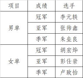 在经过两天紧张激烈的角逐后,最终李元轶、张帅鑫分别斩获男单项目冠军与亚军;在女单项目中,胡宏烨、彭仕崇同样脱颖而出,夺得冠军和亚军。本次比赛由060net永利学生会承办,学生会成员通过赛前培训,自主担任裁判员、记分员、摄影师,各司其职、紧密协作,以高度负责的态度为比赛的顺利进行保驾护航,并通过镜头记录下了选手们的精彩瞬间。