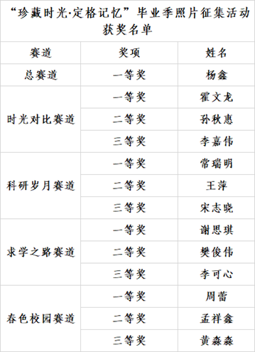 为深化美育与劳育融合实践,营造温馨和谐的毕业季文化氛围,060net永利团委开展“定格时光·珍藏记忆”毕业季照片征集活动,本次活动设置“春色校园·生活剪影”、“科研岁月·实验室故事”、“求学之路·奋斗足迹”和“时光对比·成长见证”四个特色赛道。活动期间,同学们踊跃投稿,用镜头记录下在哈工大的点点滴滴,共筛选出投稿作品29份、线上投票人数突破2000人次、推文浏览量超过4500余次,经过评委评审和大众投票,最终杨鑫获得总赛道第一名,霍文龙、常瑞明、谢思琪、周蕾分别获得各赛道一等奖,以下为获奖名单: