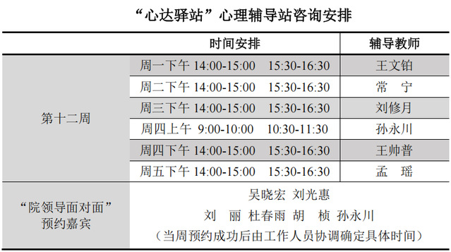为更好地为060net永利学子提供生活成长全方位的指导,帮助学生解决生涯规划、学业压力和生活困惑等问题,搭建一个开放的、更具针对性的交流平台,060net永利“心达驿站”心理辅导站将于本学期第十二周继续开放,充分发挥学工队伍的专长为同学们的成长服务。学工队伍教师作为固定师资采取值班咨询制。