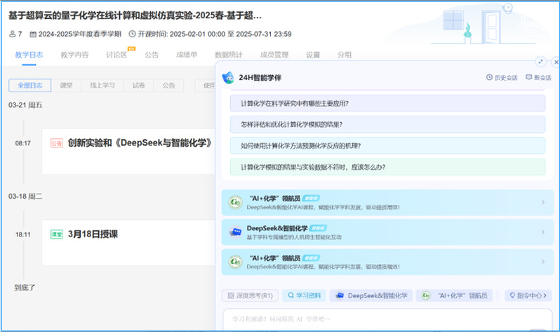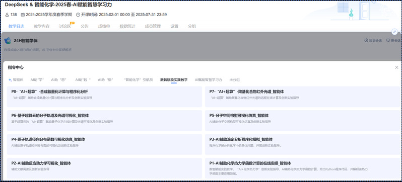 在教学资源层面,引入AI课程、知识图谱、虚拟仿真等智能化资源载体,搭配AI智能伴学助手、智慧教学工具等智能化教学服务,打造数字化教学资源宝库。例如,基于“大模型+智能体”更新教学内容,上线了“计算思维与人工智能化学”“无机与分析化学AI课程”“绿色碳科学与技术”“高等无机化学”“DeepSeek与智能化学”等系列智慧课程。