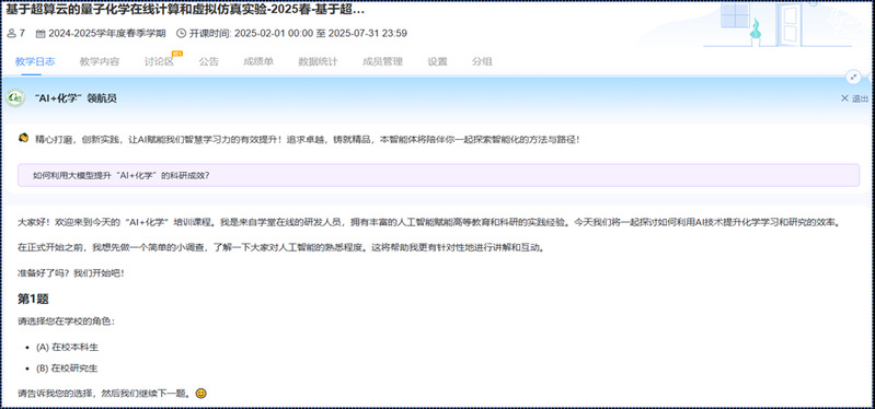 在课程知识库基础上,进一步打造能够回答学科各种问题的智能体,如术语查询AI助手、文档AI阅读助手、AI+超算实践助手、科研AI助理、AI辅助实践助手等,打造学科专属智能教学应用。同时根据学生对“学、思、践、悟”四大类智能体的实际运用情况,相应地调整课堂和讨论环节的教学方式,如适当地引导学生加强“AI助思”和“AI助悟”这两方面的训练,在课堂中增加引导和启发环节,增强学生综合能力。比如在学堂在线平台设计“AI+化学”领航员和“DeepSeek&智能化学”智能体,可以用来辅导并掌握学生对于AI技术与学科交叉融合的程度,从而方便教师指导学生更好地运用AI工具,大幅提升学习成效。
