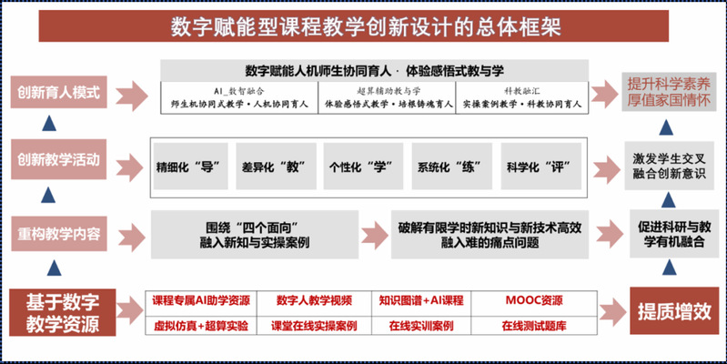 首先,教学团队重构教学内容,围绕“四个面向”融入新知识和实操案例,破解有限学时下,新知识与新技术难以高效融入的困境,促进教学和科研有机融合;其次,创新教学活动,将“导”“教”“学”“练”“评”的过程向精细化、差异化、个性化、系统化、科学化发展,激发学生建立交叉融合创新意识;第三,创新育人模式,通过数字赋能,人机师生协同育人,体验感悟式教学,提升科学素养,厚植家国情怀,共同助推科教融汇,实现课堂教学真正意义上的提质增效。