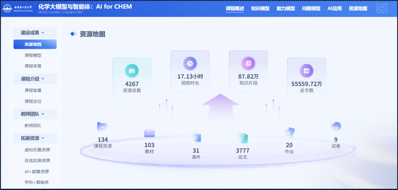 基于《计算化学》课程资源和学堂在线平台,汇集4267个资源,打造了包含87.82万个知识切片、11.1万个公式、26.1万张图片,超过5.1万份表格,集成了103本电子书的庞大课程知识库。