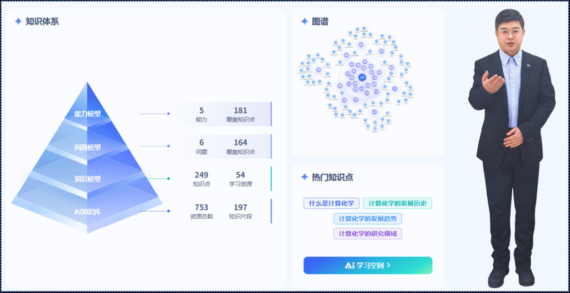 张兴文教授带领教学团队,基于学堂在线提供的课程专属AI平台,建设数字人教学视频、知识图谱和AI学伴,同时结合课程慕课、课堂在线实操案例、在线测试题库、虚拟仿真、超算实验等多样化教学资源,进行了数字赋能型课程的教学创新设计。